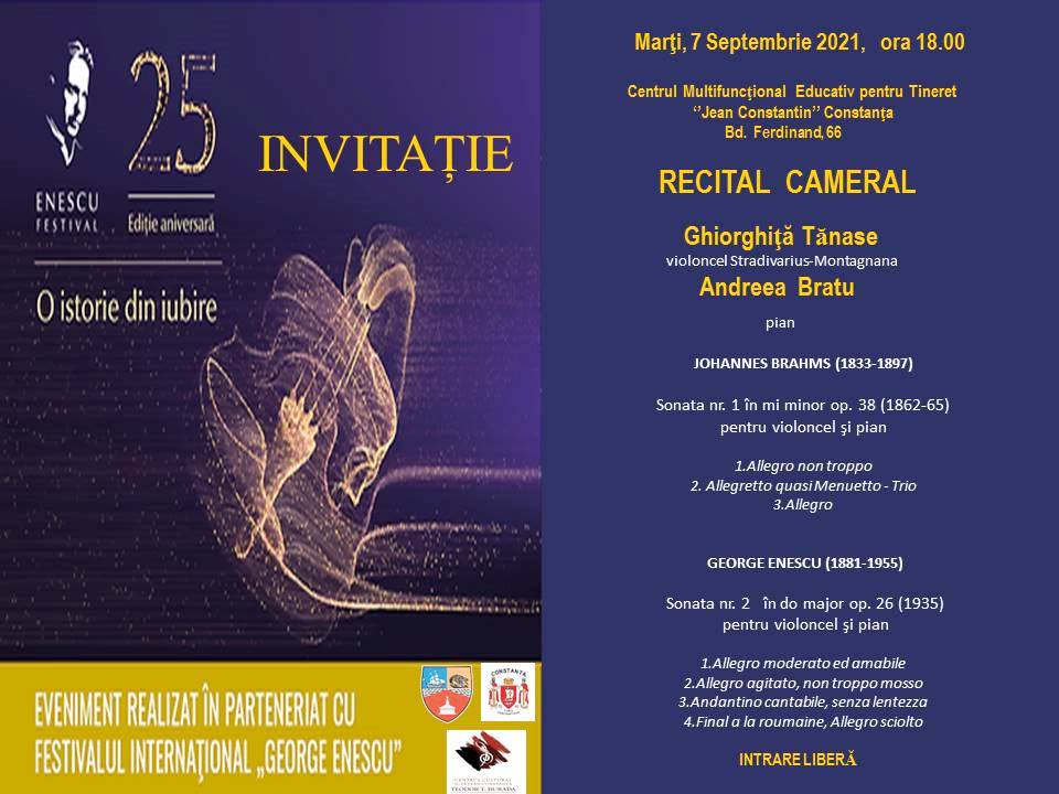 Publicul de la malul mării este invitat, marţi, 7 septembrie 2021, între orele 18.00-20.00, la Centrul Multifuncţional Educativ pentru Tineret ''Jean Constantin'' din Bd. Ferdinand nr. 66, Constanţa, la Recitalul Cameral care îi va avea protagonişti pe muzicienii Ghiorghiţă Tănase, prim-instrumentist al Teatrului Național de Operă și Balet ''Oleg Danovski’’ din Constanţa și pe Andreea Bratu, pianistă - concertistă. Intrarea este liberă, în limita locurilor disponibile.