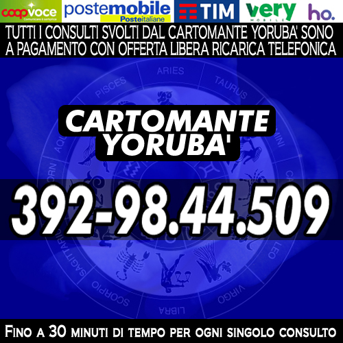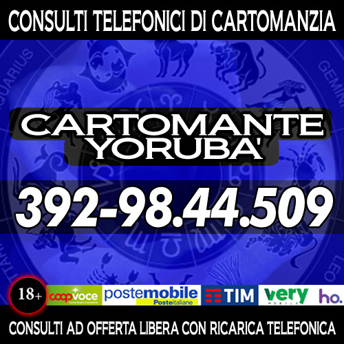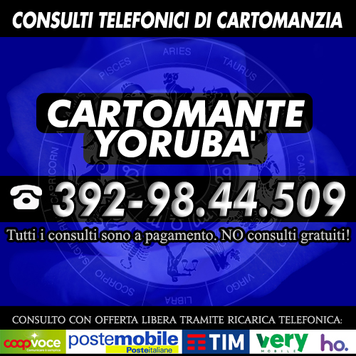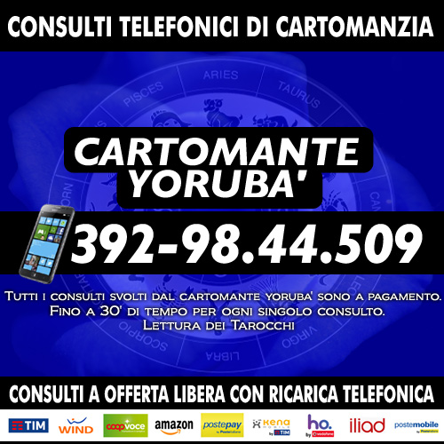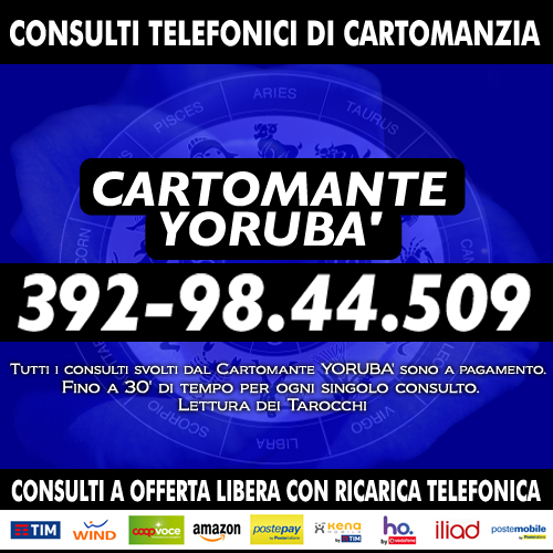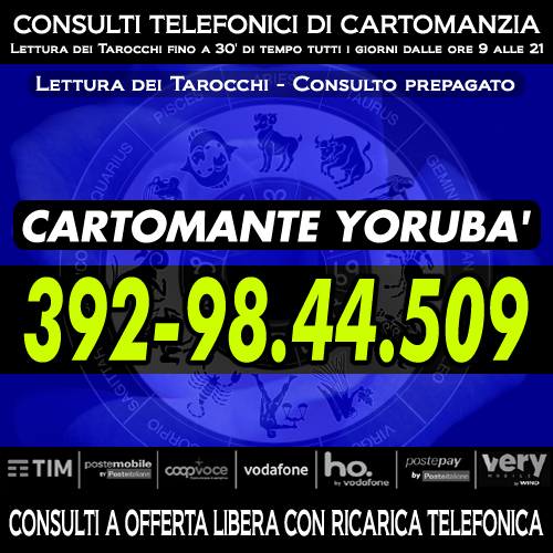 Cartomante sensitivo consulta i Tarocchi (gli Arcani Maggiori) su ogni problema che si puo' presentare nel corso della vita. Consulti approfonditi di 30 minuti. Servizio attivo tutti i giorni dalle 9 alle 21 in orario continuato. Chiama il numero di cellulare che visualizzi nell'immagine presente in questa pagina. Consulto di Cartomanzia con offerta libera con ricarica telefonica (TIM/WIND/COOPVOCE/ILIAD/KENAMOBILE/HOMOBILE/POSTEMOBILE) o ricarica POSTEPAY/AMAZON. Cartomanzia Yorubà.