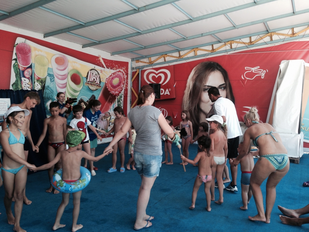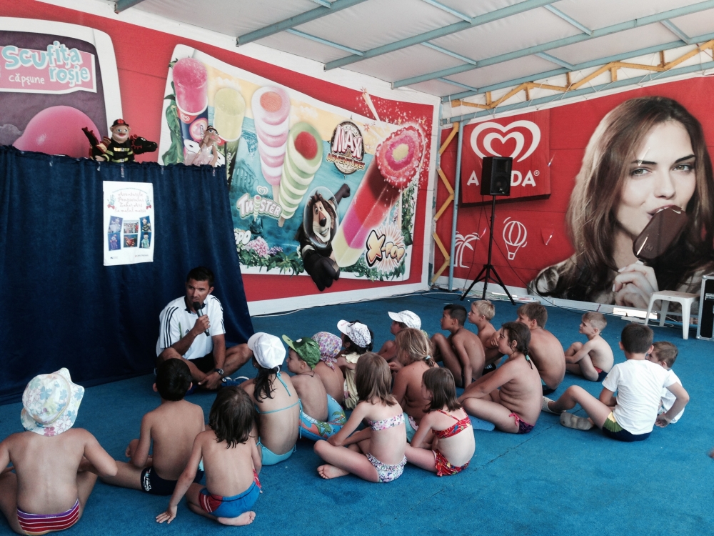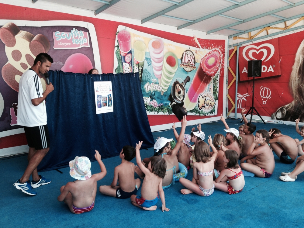 Irina Pitilină, actor păpușar voluntar: „Reacțiile celor mici sunt răsplata noastră” „Este o piesă de teatru de păpuși, pentru copiii de grădiniță. Nu avem un program fix, ne pliem în funcție de cerințele celor de la Aqua Magic și, bineînțeles, de disponibilitatea actorilor păpușari, care sunt elevi de liceu ce desfășoară această activitate voluntar. Săptămâna trecută am început reprezentațiile, iar astăzi (n.r. ieri, 22 iulie) suntem în a doua zi de reprezentații din săptămâna aceasta. Următoarele vor fi săptămâna viitoare. Tot atunci vom sărbători și Ziua Mondială a Hepatitei, care este pe 28 iulie și vom desfășura activități în paralel, noi, cei de la Fundația Baylor Marea Neagră, pe de o parte departamentul de voluntari, cu piesa de teatru, iar pe de altă parte, departamentul de testare voluntari gratuită, care va veni cu unitatea mobilă aici, în Aqua Magic”, a declarat pentru www.101stiri.ro Irina Pitilină, coordonatorul voluntarilor Fundației Baylor Marea Neagră și al proiectului care se desfășoară în prezent, Aventurile Pompierului Zahăr Ars la malul mării”. Irina Pitilină ne-a mai spus: „Piesa de teatru a luat naștere în 2013. De atunci a suferit câteva transformări, îmbunătățiri, spunem noi. Prima dată a fost sponsorizată de cei de la Cosmote, iar apoi, de doi ani, până în prezent, de cei de la OMV Petrom România. Eu consider că reacțiile celor mici sunt răsplata noastră, zâmbetele și încântarea care se văd pe fața lor atunci când urmăresc piesa de teatru, când fac cunoștință cu personajele, când îl văd pe Dințosul, personajul negative, asta ne motivează”.