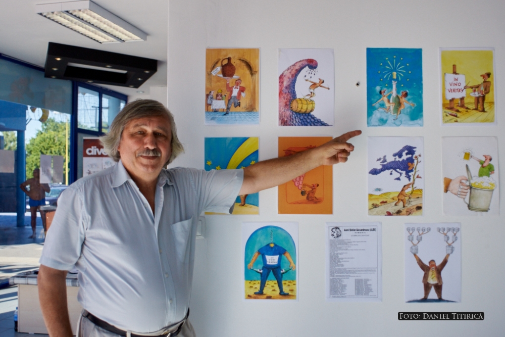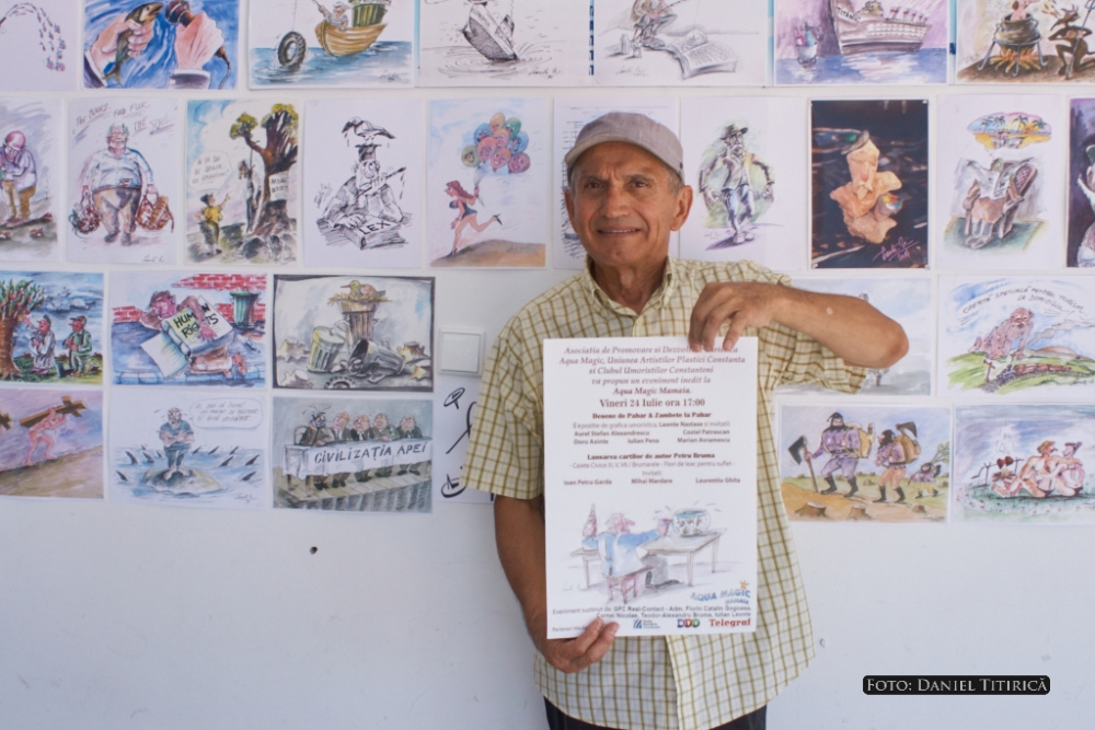 Petru Brumă, scriitorul umorist care promovează caricatura „Ideea expoziţiei a pornit de la scriitorul de umor Petru Brumă. Acesta a scris „Brumărele-Flori de leac pentru suflet”, carte ilustrată cu lucrări realizate de mine sau de colegii mei de simeze, Aurel Ştefan Alexandrescu, Costel Pătrăşcan - exponent al Academiei Caţavencu, Doru Axinte, Iulian Pena şi Marian Avramescu. Atunci a apărut această idee de a face lansare de carte la Aquatecă, pe simezele căreia să existe lucrări de umor. Experimentul acesta simpatic a dat roade, în sensul că au răspuns pozitiv atât colegii mei, cât şi cei de la Aqua Magic. Aceste forme culturale estivale, chiar dacă nu se desfăşoară într-o sală specifică a teatrului sau a sălilor de expoziţie, pot fi consumate şi în acest context. Noi am adus caricatura în întâmpinarea publicului, abordând cu umor tematici sociale, politice, de protecţia mediului”, a declarat graficianul și caricaturistul Leonte Năstase.