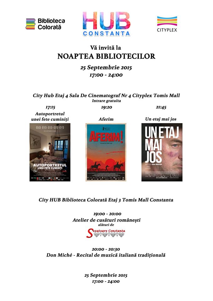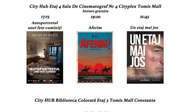 Cu sprijinul Cityplex, Biblioteca Colorată va difuza trei filme româneşti de excepţie (intrare gratuită) la City Hub, etaj 4, în sala de cinematograf nr. 4, Cityplex Tomis Mall. Astfel, la ora 17.15, cinefilii vor putea viziona filmul „Autoportretul unei fete cuminți”, urmat de „Aferim!”, la ora 19.20 şi „Un etaj mai jos”, la ora 21.45. Tot astăzi, între orele 19.00 şi 20.00, Șezătoarea Constanţa va desfăşura un atelier de cusături româneşti, ziua urmând să fie încheiată de Don Miché, cu un recital de muzică italiană tradiţională programat între orele 20.00-20.30.