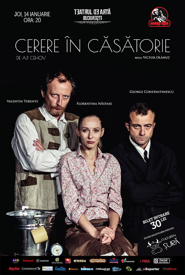 Publicul amator de teatru în spații neconvenționale va putea asista la o... inedită „Cerere în căsătorie”, moment romantic, dar și comic deopotrivă, care se va petrece pe scena clubului constănțean Doors. Nu este vorba, desigur, despre o „cerere” reală, ci de un spectacol savuros, având la bază un text de A.P. Cehov și care va face deliciul constănțenilor. Evenimentul este programat la clubul Doors pe data de 14 ianuarie, de la ora 20.00, iar protagoniști vor fi actori ai Teatrului de Artă București.