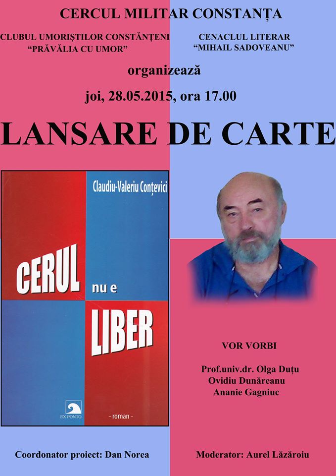 După cele două volume-confesiune, „Dragostea și Securitatea” și „Îngerii loviți”, lansate cu succes, în urmă cu mai bine de doi ani, Claudiu-Valeriu Conțevici (Claudiu Val), jurnalist de marcă în presa constănțeană, scriitor și epigramist, aduce în fața publicului de la malul mării noua sa carte, „Cerul nu e liber”. Cel de-al treilea și ultimul volum din trilogia autobiografică a autorului - trilogie care marchează, de fapt, debutul ca romancier al lui Claudiu-Valeriu Conțevici - va fi prezentat, joi, 28 mai, de la ora 17.00, la Cercul Militar Constanța. Va fi un eveniment cultural deosebit, în care „literarura și umorul își dau mâna”, spun organizatorii. Astfel, lansarea editorială se va desfășura în cadrul întâlnirii de lucru comune a Clubului Umoriștilor Constănțeni (CUC) „Prăvălia cu umor" și a Cenaclului literar „Mihail Sadoveanu".
