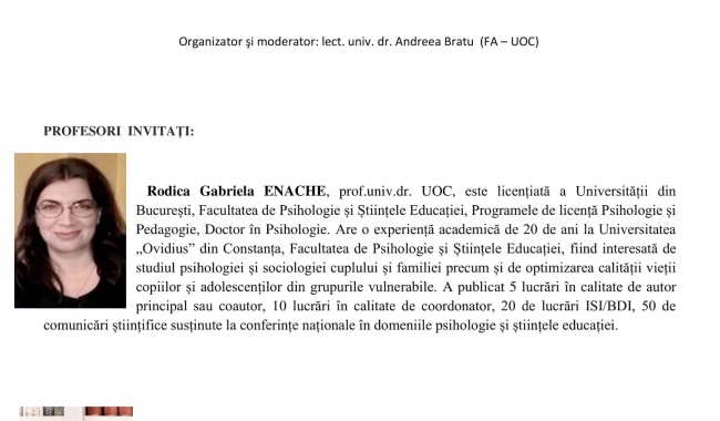 lect. univ dr. Enache Tuşa (specializarea Sociologia Educaţiei-Identităţi regionale de la Facultatea de Psihologie şi Ştiinţele Educaţiei - UOC);