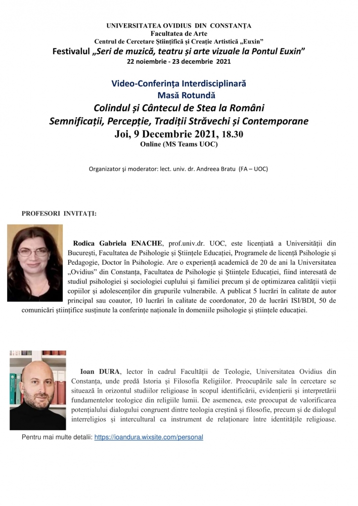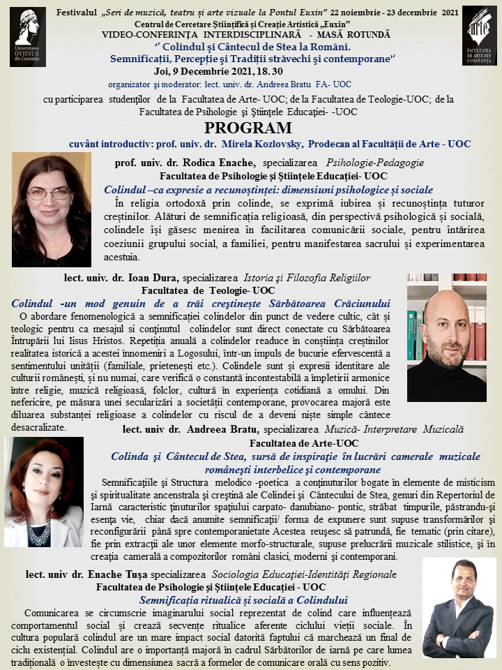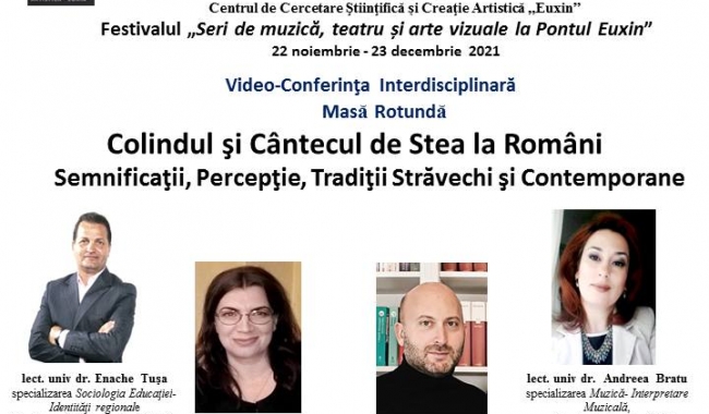 Facultatea de Arte a Universității “Ovidius” Constanța (UOC), prin Centrul de Cercetare Ştiinţifică și Creaţie artistică „Euxin”, continuă suita de evenimente din cadrul Festivalului „Seri de muzică, teatru și arte vizuale la Pontul Euxin” (22 noiembrie - 23 decembrie 2021), cu o video-conferință interdisciplinară a cărei temă se încadrează perfect perioadei sărbătorilor de iarnă, fiind dedicată tradițiilor și datinilor populare românești. Organizată sub forma unei mese rotunde online, manifestarea se va derula joi, 9 decembrie 2021, între orele 18.30 - 20.30, sub titulatura “Colindul și Cântecul de Stea la români. Semnificații, Percepție, Tradiții străvechi și contemporane”.
