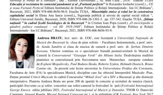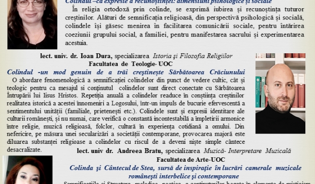 Lect. univ dr. Andreea Bratu, Facultatea de Arte - specializarea Muzică - Interpretare Muzicală): “Colinda şi Cântecul de Stea, sursă de inspiraţie în lucrări camerale muzicale româneşti interbelice şi contemporane”