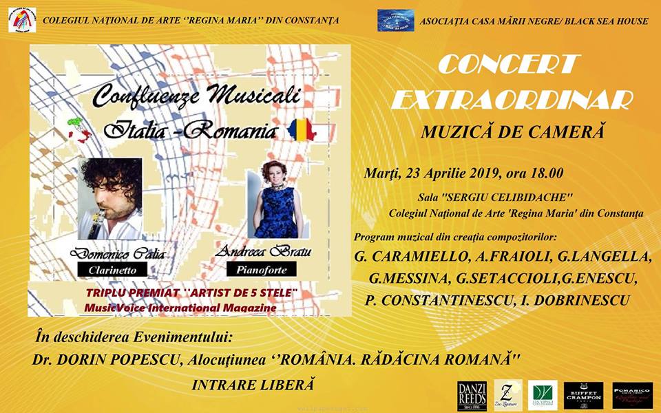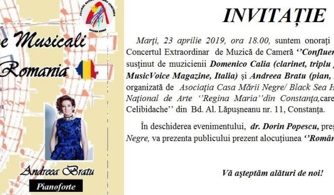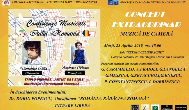 Constănțenii sunt invitați la Concertul Extraordinar ''Confluenze Musicali. România-Italia'' (muzică de cameră), organizat în Sala ''Sergiu Celibidache'' a Colegiului Naţional de Arte "Regina Maria", marţi, 23 aprilie 2019, în intervalul orar 18.00-19.15. Intrarea la acest eveniment special dedicat publicului de la malul mării și organizat de Asociaţia "Casa Mării Negre / Black Sea House", în parteneriat cu prestigiosul Colegiu Naţional de Arte "Regina Maria" din Constanţa, este liberă.