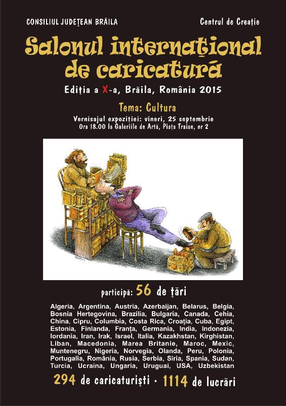 Orașul Brăila devine, în perioada 25 - 27septembrie, Capitala Europeană a Umorului! Timp de trei zile, 294 caricaturiști din 56 de țări vor expune 1114 lucrări, în cadrul Salonului Internațional de Caricatură, ediția a X-a, iar vernisajul expoziției este programat vineri, 25 septembrie, de la ora 18.00, la Galeriile de Artă din Piața Traian nr. 2. Tema ediția din acest an a Salonului de Caricatură este „Cultura”.