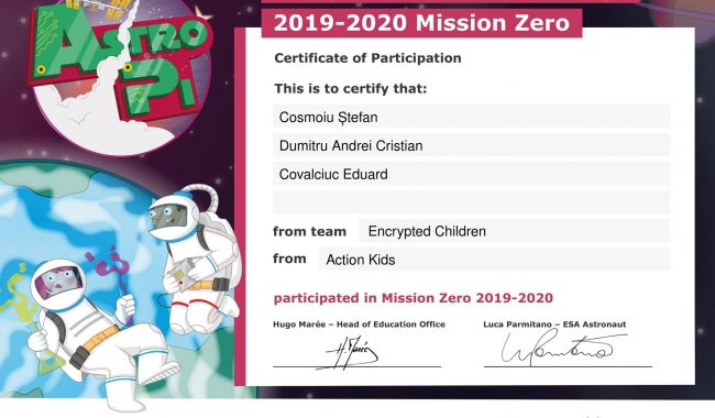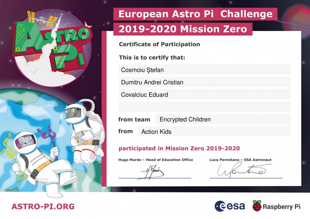 Certificatul primit drept recunoaștere a participării lor la acest proiect poartă semnătura lui Luca Parmitano, astronaut în Corpul European de astronauți pentru Agenția Spațială Europeană și a lui Hugo Marée, directorul Biroului de Educație al Agenției Spațiale Europene (ESA).
