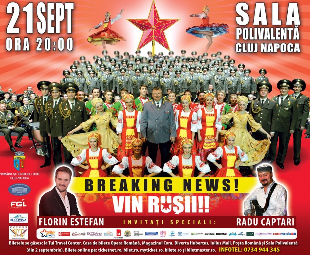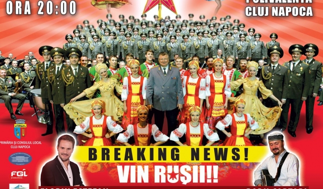 Un fenoment bizar s-a petrecut la Cluj, zilele acestea, pe toate afișele spectacolului „The Red Army Choir/ Corul Armatei Roșii” expuse în spațiul public al orașului fiind lipite anunțuri false, care informau în mod eronat publicul că evenimentul a fost anulat. Orașul a fost împânzit, astfel, de anunțuri cu textul „Spectacol anulat”, atașate chiar posterelor originale, creând confuzie în rândurile iubitorilor muzicii. În aceste condiții, organizatorii au luat poziție în mod ferm, transmițând www.101stiri.ro, într-un comunicat de presă, că „este vorba de o acțiune rău intenționată”. Aceștia doresc să informeze oficial că evenimentul se va desfășura conform programului stabilit. Astfel, luni, 21 septembrie, artiștii The Red Army Choir vor putea fi admirați la Sala Polivalentă din Cluj, începând cu ora 20.00, urmând ca în zilele de 22 și 23 septembrie să evolueze pe scena Sălii Palatului din Capitală, de la aceeași oră.