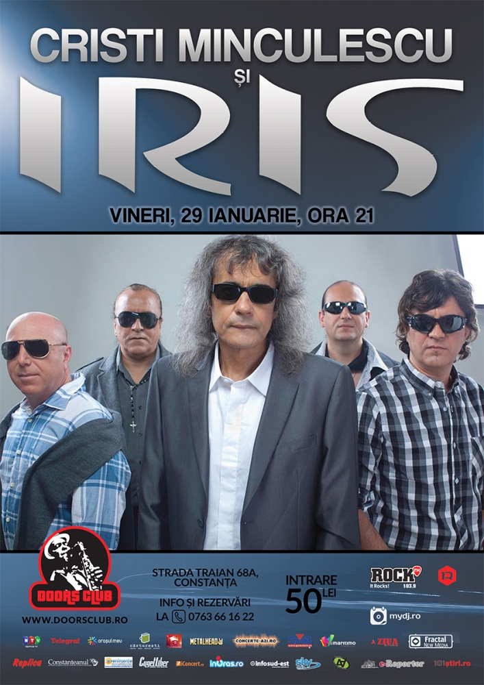 Constănțenii se vor bucura, la început de weekend, de un concert de senzație, care aduce în prim-plan câțiva artiști din generația de aur a rock-ului autohton. Astfel, publicul de la malul mării este invitat vineri, 29 ianuarie, de la ora 21.00, în clubul constănțean Doors, pentru a urmări un recital incendiar oferit de Cristi Minculescu & Iris. Astfel, pe scena clubului vor cânta: Cristi Minculescu (voce), Nelu Dumitrescu (tobe), Valter Popa (chitară), Doru Borobeică (bas) şi Relu Marin (clape), care vor include în repertoriul de concert și hiturile Iris, de pe cele 19 albume lansate de-a lungul timpului.