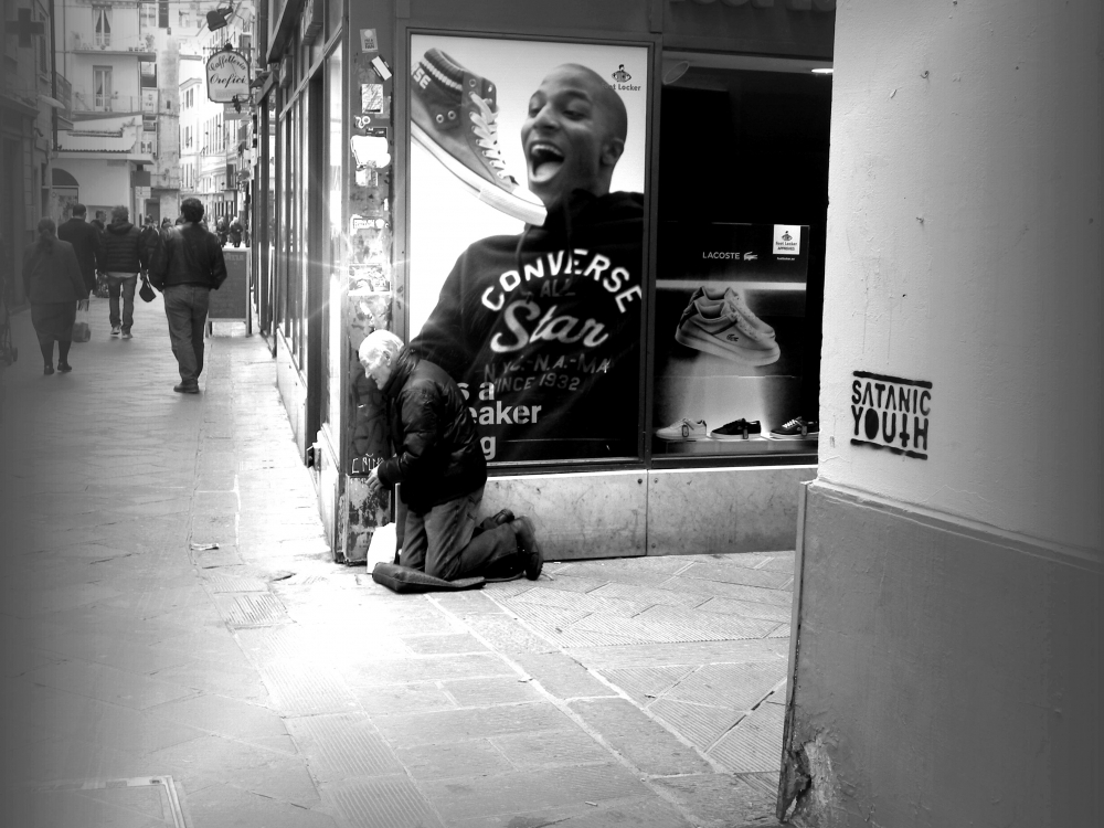 Fotografiile sunt realizate în La Spetzza, Italia. L-am observat pe acel om înainte de a se aşeza acolo, în colţ. Avea o expresie arogantă plină de repulsie faţă de stradă, faţă de oamenii care treceau pe lângă el. Nici o urmă de bunăvoinţă şi amabilitate. Era expresia unui om rău.