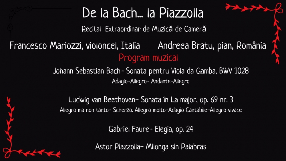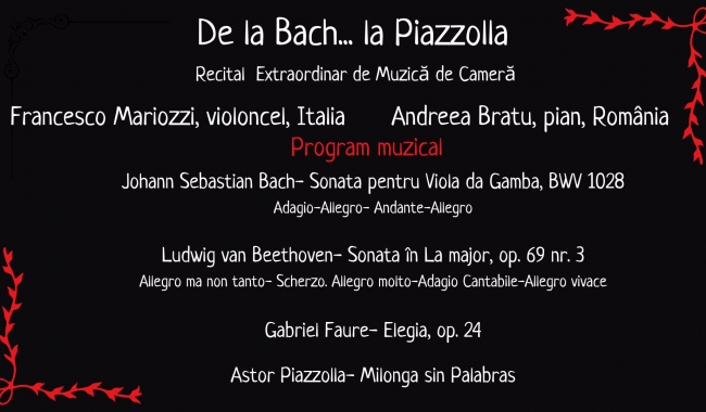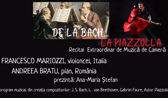 Consiliul Județean Constanța, prin Centrul Cultural Județean Constanța ,,Teodor T. Burada” și Centrul Multifuncțional Educativ pentru Tineret „Jean Constantin”, vă invită la Recitalul extraordinar de muzică de cameră ,,DE LA BACH... LA PIAZZOLLA”, cu violoncelistul concertist FRANCESCO MARIOZZI (Italia) și pianista ANDREEA BRATU (Constanța-România).