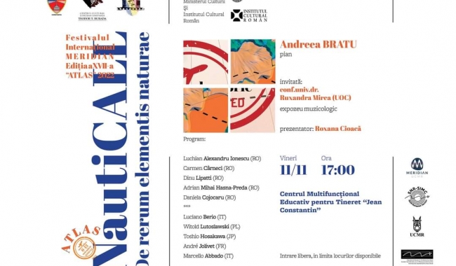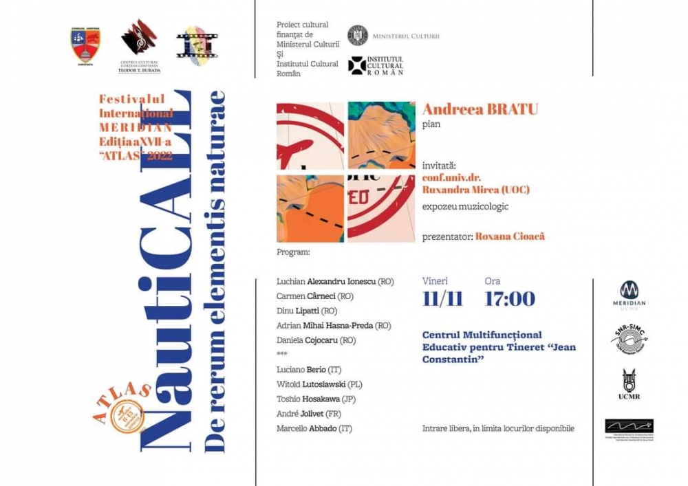 Prestigiosul Festival Internațional de Muzică Nouă MERIDIAN 2022: „ATLAS”, ediția a XVII-a ajunge mâine, 11 noiembrie 2022, și la Constanța, printr-un eveniment cultural special, a cărui protagonistă este apreciata pianistă de la malul mării, Andreea Bratu. Spectacolul prezentat sub titulatura „NautiCALL: De Rerum Elementis Naturae” se va desfășura la Centrul Multifuncțional Educativ pentru Tineret „Jean Constantin”, cu începere de la ora 17.00, fiind o acțiune culturală de anvergură, organizată de Consiliul Județean Constanța, prin Centrul Cultural Județean “Teodor T. Burada”.