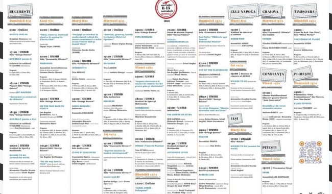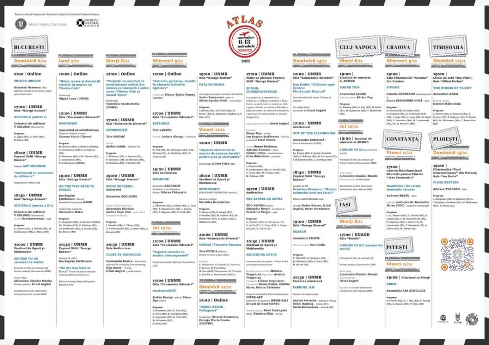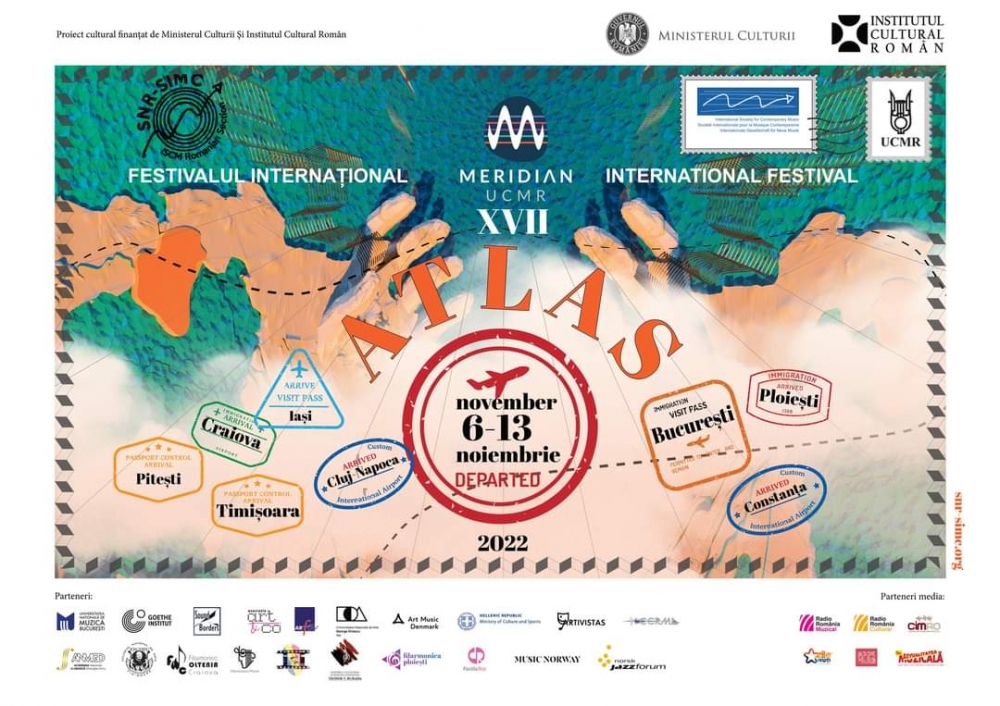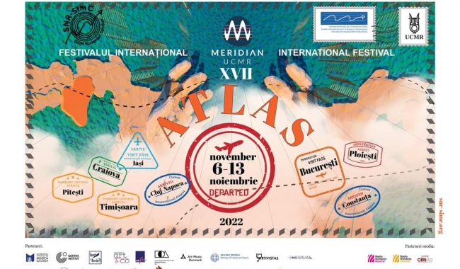 Hărți sonore, trasee imaginare dar şi reale, un automat cu suveniruri de călătorie, concerte, conferințe, instalație audio-vizuală online, reality show cu lectură-ruletă, muzică electronică, un film de animație 3D cu muzică din 13 țări, improvizație pe bicicletă, concert-ocol şi o călăuză cu bagaj sonor, evenimente multimedia, cărți poştale cu muzică imaginară şi o parcare în miez de jazz – iată evenimentele incluse în cadrul celei de-a XVII-a ediții a Festivalului Internațional MERIDIAN, unul din cele mai importante festivaluri de muzică nouă din țară care se desfăşoară între 6 şi 13 noiembrie 2022 sub tema „ATLAS”, la Bucureşti, Cluj-Napoca, Timişoara, Craiova, Constanța, Ploieşti, Piteşti şi Iaşi.