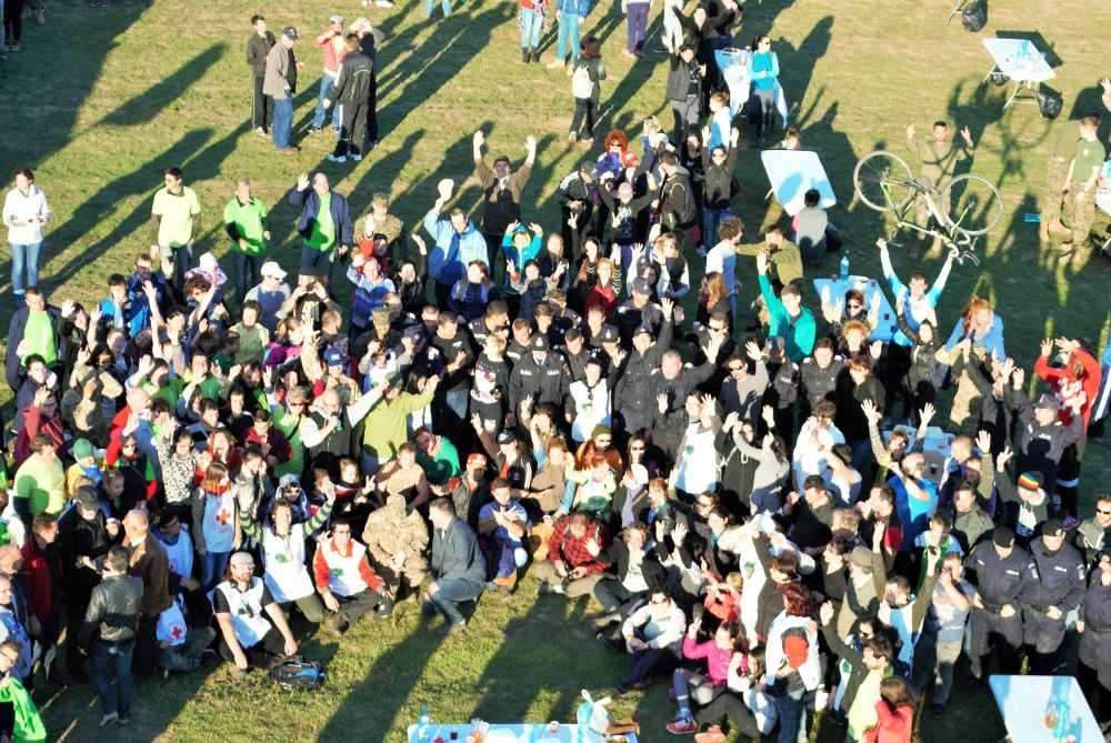 Poza de grup! Apoi am revenit la bază, unde ne aṣtepta o masă. Eram deja la rând pentru mâncare ṣi mă înveselisem cu un păhărel de ṭuică fiartă, când am primit vestea că e timpul să ies din rând, pentru că urma să mă ridic la cer ca să fac poza de grup.