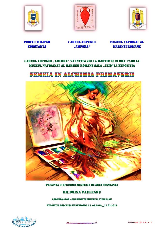 Careul artelor "Amfora" Constanța invită publicul de la malul mării la vernisajul tradiționalei expoziții de primăvară. Organizată sugestiv, sub titulatura "Femeia în alchimia primăverii", expoziția va fi deschisă joi, 14 martie 2019, ora 17.00, la Muzeul Național al Marinei Române Constanța, sala "Clio".