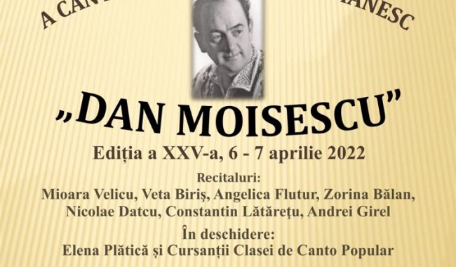 Publicul constănțean iubitor de muzică populară are prilejul de a participa, în luna aprilie, la cea de a XXV - a ediție a Festivalului Concurs Național de Interpretare a Cântecului Popular Românesc „Dan Moisescu”, organizat de Consiliul Județean Constanța, prin Centrul Cultural Județean Constanța „Teodor T. Burada”. Festivalul se va desfășura în intervalul 6 - 7 aprilie 2022, pe scena Centrului Multifuncțional Educativ pentru Tineret „Jean Constantin”, intrarea fiind liberă.