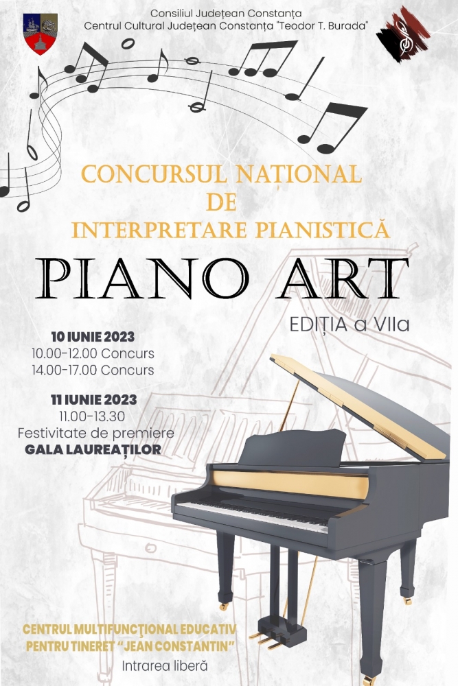 Cea de-a VII-a ediție a Concursului Național de Interpretare Pianistică „Piano Art” se apropie cu pași repezi. Evenimentul este organizat de Consiliul Județean Constanța, prin Centrul Cultural Județean Constanța „Teodor T. Burada” și se va desfășura în intervalul 10-11 iunie 2023, în Sala de Concert a Centrului Multifuncțional Educativ pentru Tineret ,,Jean Constantin”. Intrarea publicului în cele două zile de concurs este liberă.