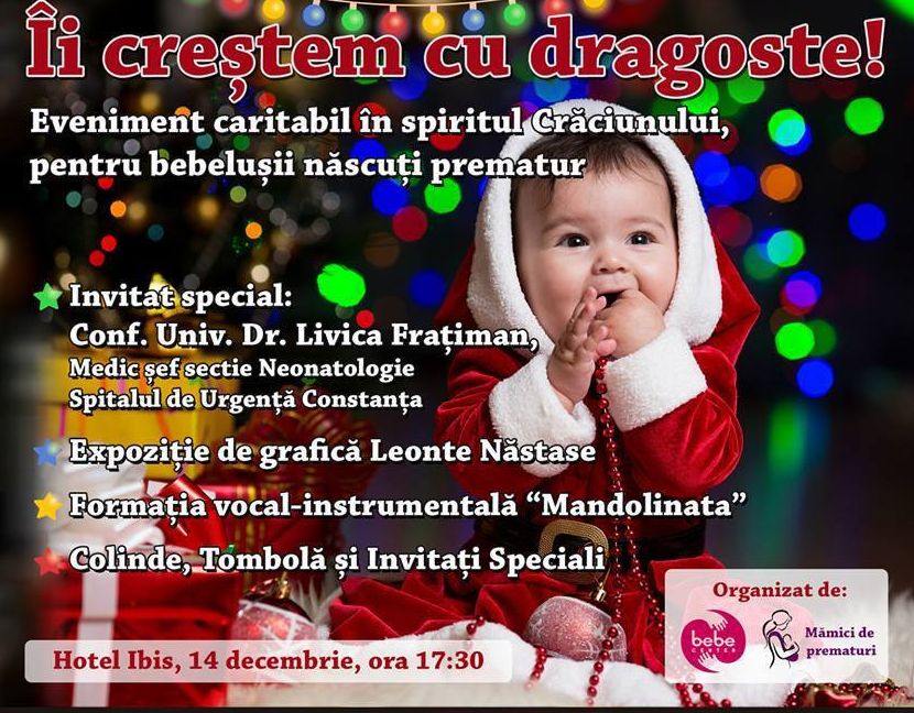 „Îi creștem cu dragoste!” este titulatura sub care se va desfășura astăzi, 14 decembrie, de la ora 17.30, în sala Ovidiu a hotelului Ibis din Constanța, acțiunea cu scop umanitar „Îi creștem cu dragoste!”. Manifestarea este dedicată mămicilor și copiilor născuți prematur și Secției de Prematuri de la Spitalul Județean Constanța.
