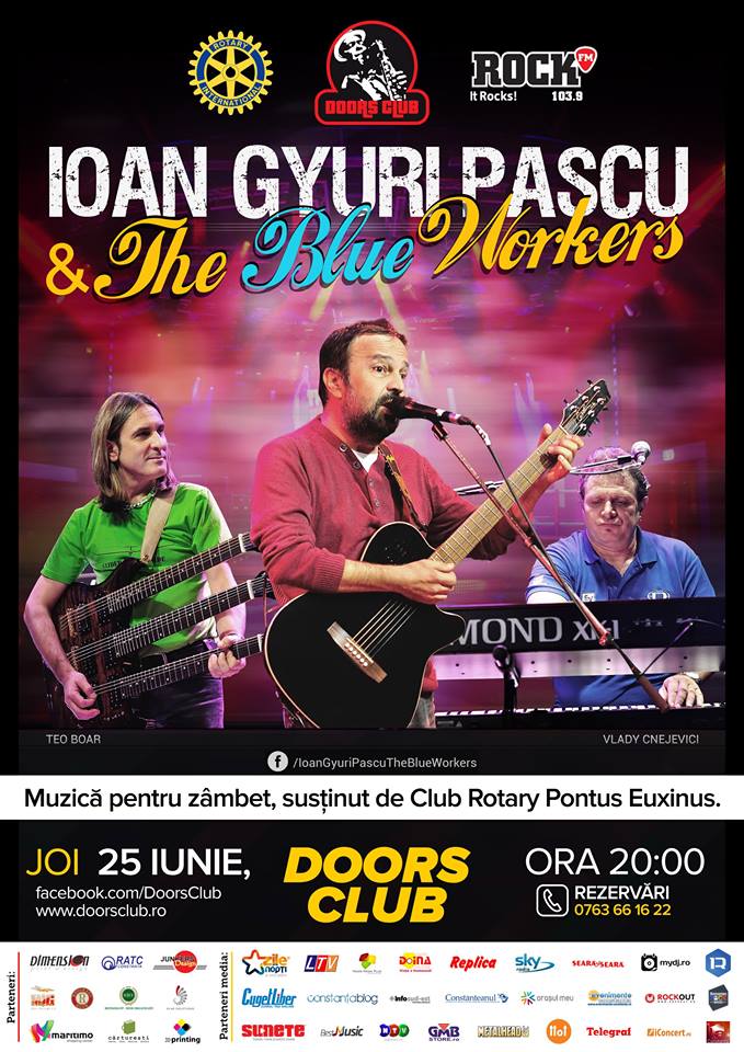 Constănțenii, cât și publicul estival de la malul mării sunt așteptați, pe 25 iunie, de la ora 20.00, în clubul Doors, la o seară specială în compania lui Ioan Gyuri Pascu și a band-ului său, The Blue Workers. Concertul Ioan Gyuri Pascu & The Blue Workers este unul caritabil și se înscrie în campania „Muzică pentru un zâmbet", inițiată de Club Rotary Pontus Euxinus și susținută de Doors Club. Prețul biletelor este de 50 de lei, acestea putându-se procura de la sediul clubului gazdă.