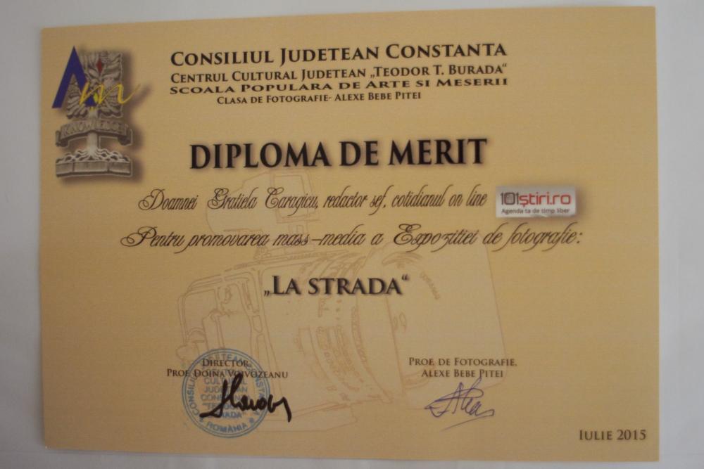 Ziarul online www.101stiri.ro, distins cu Diplomă de Merit „Pentru promovarea mass-media a Expoziției de fotografie La Strada” De menționat este faptul că ziarul online www.101stiri.ro a fost distins cu Diplomă de Merit „Pentru promovarea mass-media a Expoziției de fotografie La Strada”, distincție acordată de Consiliul Județean Constanța, prin Centrul Cultural Județean „Teodor T. Burada” - Clasa de Fotografie Alexe Bebe Pitei.