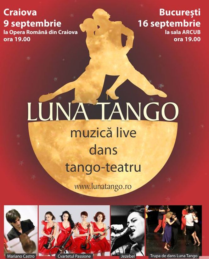 Sala ArCub din Capitală este gazda unui spectacol inedit, „Luna Tango”, miercuri, 16 septembrie, începând cu ora 19.00. Show-ul este bazat pe o poveste inspirată din serile pasionale de tango argentinian, adusă în fața spectatorilor într-o formă originală de către echipa artistică formată din Andrei Baican, Szasz Levente, Erwin Simsensohn și Alina Herescu.