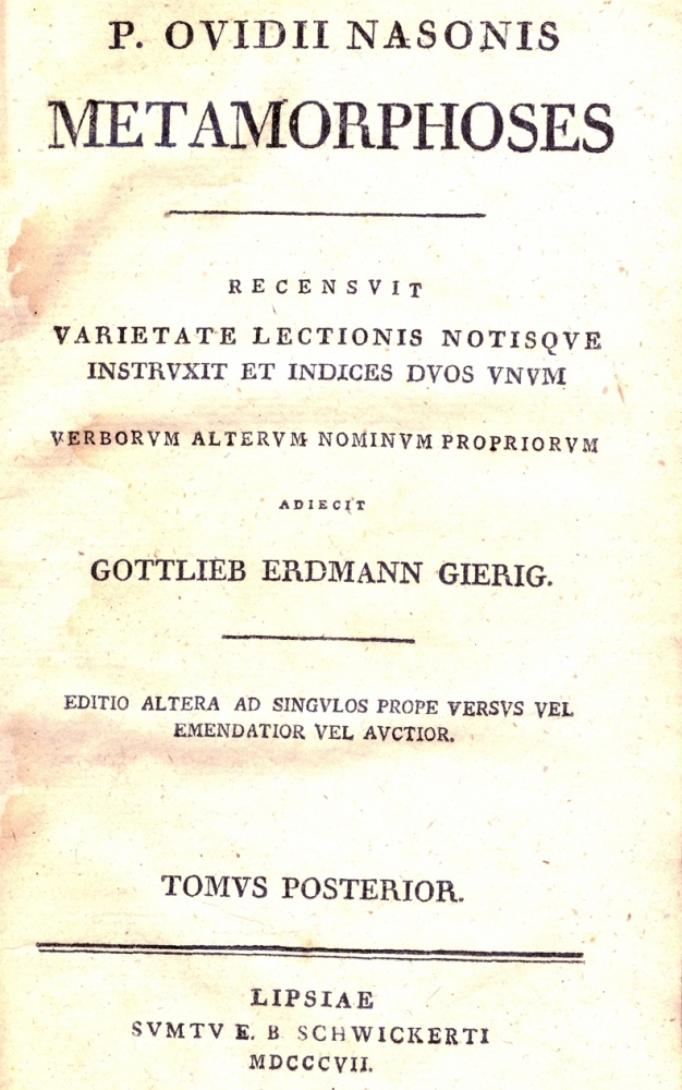 Ediție de o valoare excepțională Poemul „Metamorfoze”, una dintre capodoperele lui Ovidius, a cunoscut multiple ediţii tipărite, fiind şi astăzi tradusă, publicată, judecată, citită. Valoarea cu totul deosebită a celei de faţă este dată de comentariile lui Gottlieb Erdmann Gierig (1742 - 1814), care a fost profesor la Universitatea din Dortmund şi unul dintre cei mai apreciaţi specialişti în opera ovidiană.
