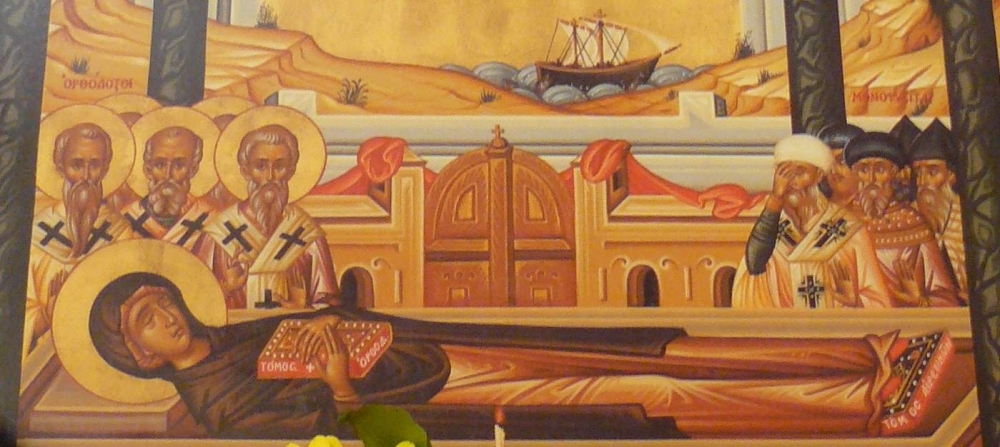 După câteva zile, au deschis din nou racla și au văzut că la picioarele ei se afla cartea ereticilor, iar cea a Sfinților Părinți - în mâinile ei.