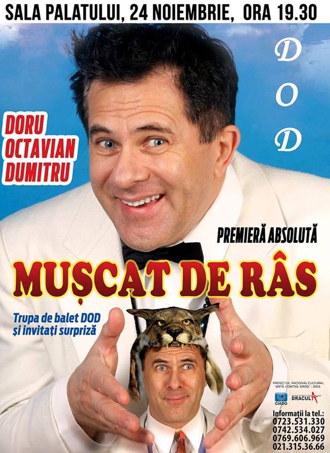 Doru Octavian Dumitru, unul dintre cei mai în vogă comedianți ai României anilor ‘90, revine pe scena Sălii Palatului, marți, 24 noiembrie, de la ora 19.30, cu show-ul de comedie „Mușcat de râs”. Spectacolul este o producție modernă, care prezintă publicului din anul 2015 îngrijorările omului cu sine și relația cu cel de lângă el. „Mușcat de ras” este un show de calitate, cu un umor elegant și substanțial.