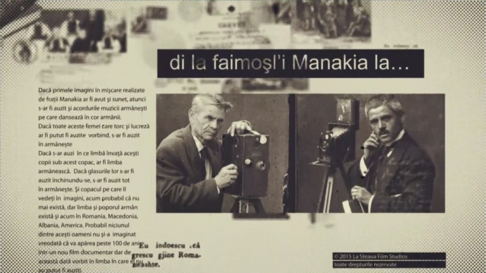 Film vorbit în aromână Filmul documentar „ARMÂNII, de la faimoșii Manakia la Nu sunt faimos…” este vorbit, în cea mai mare parte, în aromână și este o producție independentă, realizată în exclusivitate din fonduri private. Acesta va avea subtitrare în română, engleză, albaneză, macedo-slavă.
