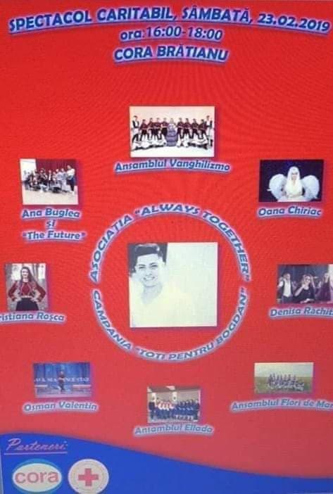 Sâmbătă, 23 februarie, la CORA Brătianu Constanța a avut loc evenimentul caritabil organizat de Asociația Always together (director executiv Erdal Mustafa), în sprijinul tânărului Bogdan Marghiol. Acesta se află internat într-o clinică din Turcia, deoarece în România nu i se mai dădea nicio șansă la viață.