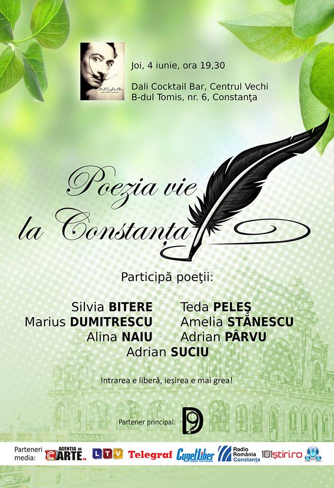Un nou eveniment inedit, dedicat consumatorilor de literatură de la malul mării, va avea loc, mâine, 4 iunie, de la ora 19.30, la Dali Cocktail Bar din Centrul Vechi al Constanței. Manifestarea se va desfășura sub o titulatură cât se poate de sugestivă, „Poezia Vie la Constanţa”, de organizare și... antren urmând să se ocupe poetele Amelia Stănescu și Silvia Bitere.