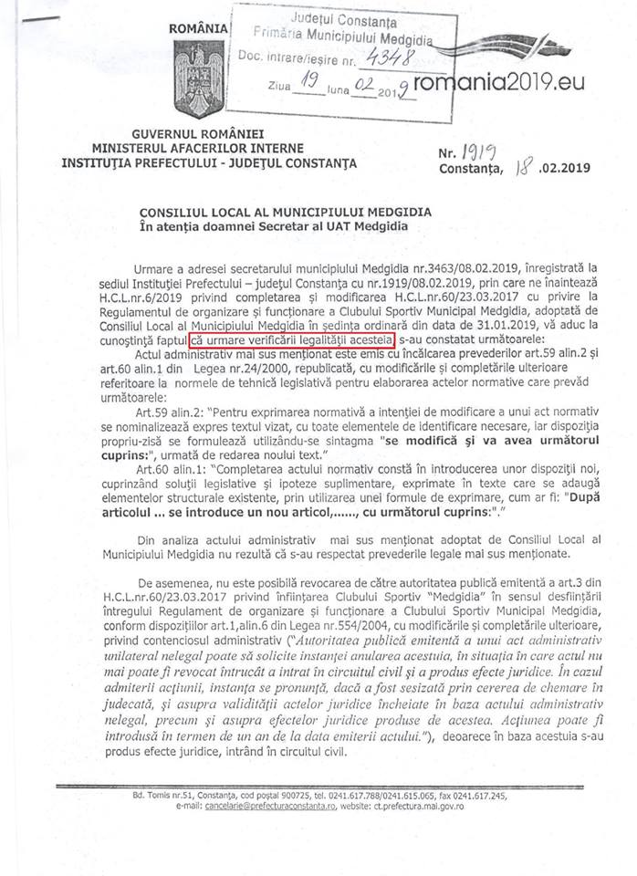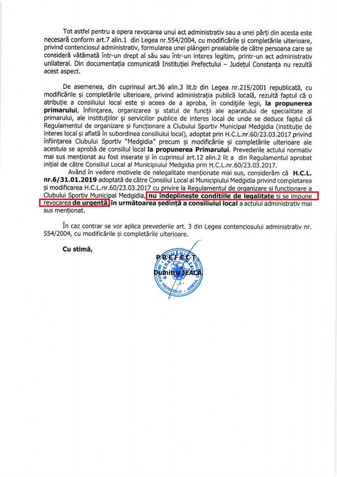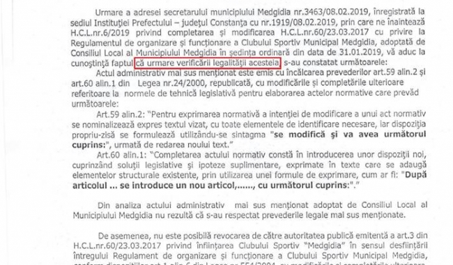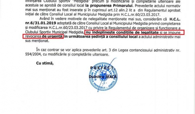 'Astăzi, Primăria Municipiului Medgidia a primit răspunsul Prefecturii Constanța care declară nelegală hotărârea adoptată de consilierii locali Butnaru Marian, Vlădescu Luminița, Ion Narcis Ion, Rotaru Aurel, Trifan Alin, Pricop Constantin, Gheorghiu Georgiana, Feuzi Ismail, Păun Nicolae, Chiriță Liviu și Menan Samir, cu privire la funcționarea Clubului Sportiv Medgidia.