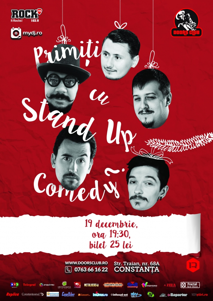 Clubul Doors le propune constănțenilor, în această frumoasă perioadă a sărbătorilor de iarnă și a colindelor, un show de stand-up comedy incitant, intitulat sugestiv: „Primiți cu stand-up comedy?”. Spectacolul se va desfășura sâmbătă, 19 decembrie, de la ora 19.30, când publicul este invitat la o... porție de râs cu George Bonea, Victor Drăgan, Daniel Hărmănescu, Marius Covache și Claudiu Popa.