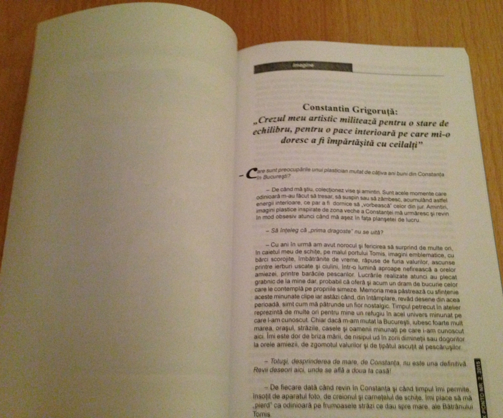 Plasticianul Constantin Grigoruță: „Îmi este dor de briza mării, de nisipul ud în zorii dimineții sau dogoritor la orele amiezii, de zgomotul valurilor și de țipătul ascuțit al pescărușilor” Dealtfel, apreciatul prozator Ovidiu Dunăreanu, redactor șef al publicației Ex Ponto și membru al Uniunii Scriitorilor din România, îi dedică lui Constantin Grigoruță, membru al Uniunii Artiștilor Plastici din România, un material de excepție. Este vorba despre interviul cu titlul „Crezul meu artistic militează pentru o stare de echilibru, pentru o pace interioară pe care mi-o doresc a fi împărtășită cu ceilalți”, în care plasticianul, în dialog cu Ovidiu Dunăreanu, vorbește mai ales despre „prima sa dragoste”, Constanța și despre amintirile care îl leagă de „bătrânul Tomis”. „Chiar dacă m-am mutat la București, iubesc foarte mult marea, orașul, străzile, casele și oamenii minunați pe care i-am cunoscut aici. Îmi este dor de briza mării, de nisipul ud în zorii dimineții sau dogoritor la orele amiezii, de zgomotul valurilor și de țipătul ascuțit al pescărușilor”, mărturisește Constantin Grigoruță în interviul acordat revistei Ex Ponto.
