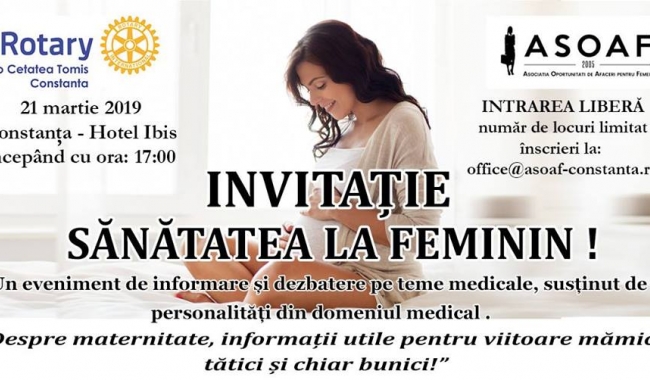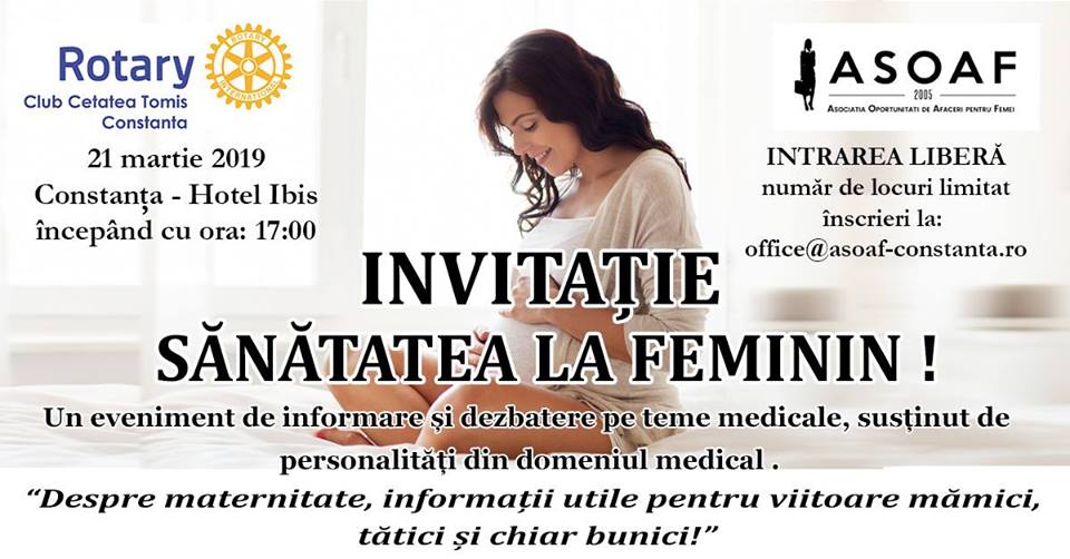 Viitoarele mămici, dar și bunici și chiar tătici sunt așteptați, joi, 21 martie 2019, la Hotelul Ibis din Constanța, la un eveniment cu totul special, ajuns la cea de-a II-a ediție. Este vorba despre "Sănătatea la Feminin", manifestare organizată de Asociația Oportunități de Afaceri Constanța, în parteneriat cu Club Rotary Cetatea Tomis Constanța, în cadrul căreia vor fi prezenți medici de renume din Constanța, ce vor prezenta publicului informații deosebit de utile.