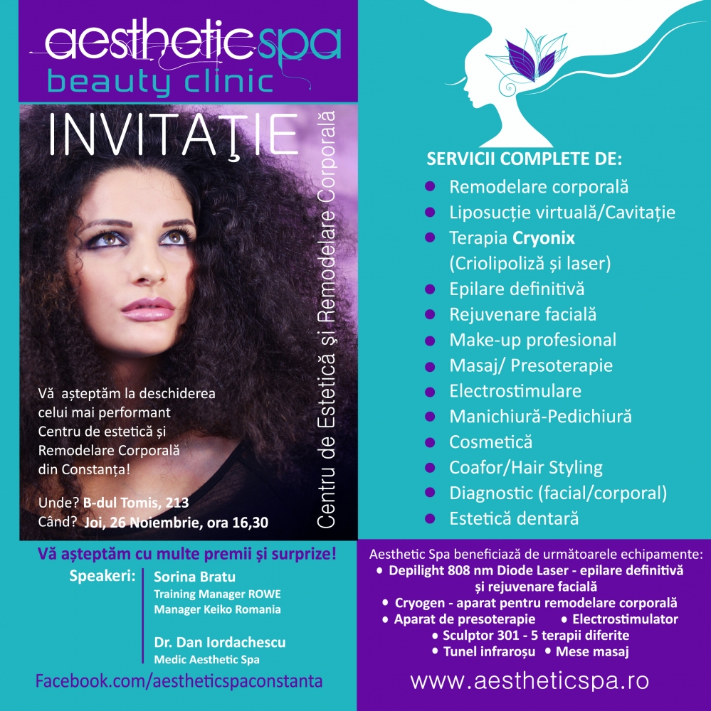 Centru de Estetică și Remodelare Corporală Constănțencele - și nu numai ele - preocupate de sănătate și frumusețe vor fi interesate, cu siguranță, de lansarea oficială a clinicii de estetică și remodelare corporală Aesthetic Spa. Centrul de Estetică și Remodelare Corporală Aestehtic Spa va fi inaugurat oficial joi, 26 noiembrie, de la ora 16.30, la eveniment fiind așteptați și clienții care și-au arătat intenția de a participa la deschidere, pentru a afla mai multe detalii despre tratamentele oferite în cadrul clinicii.