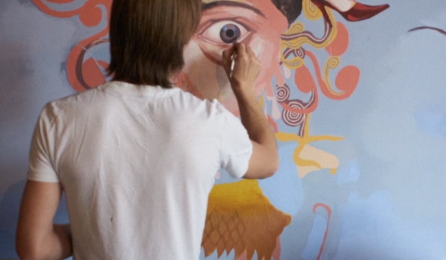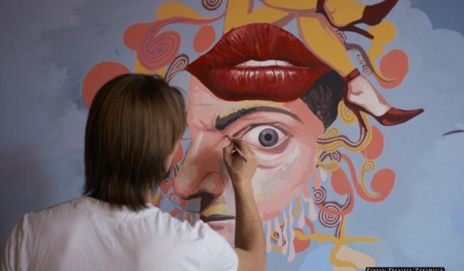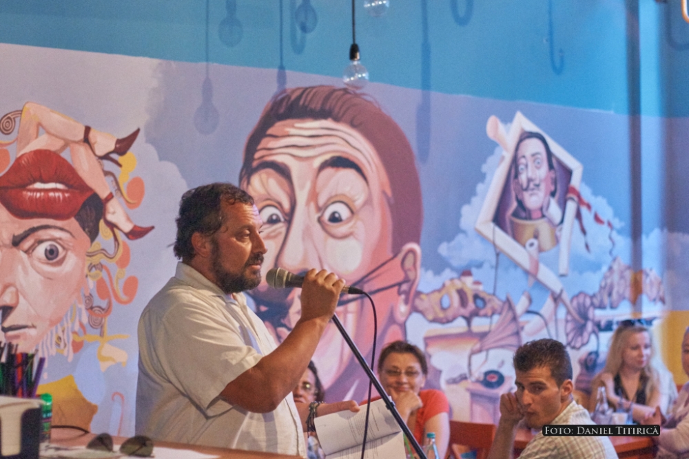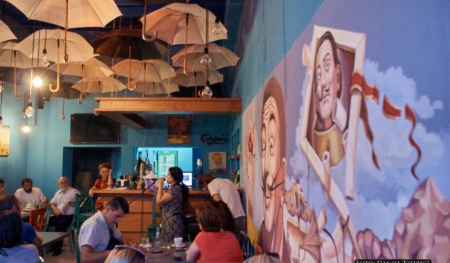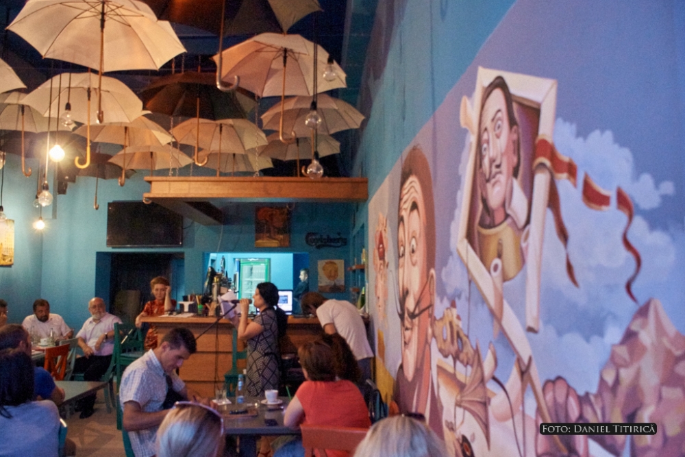 Dialog al poeziei cu artele vizuale Și pentru că literatura a invitat la… dialog artele vizuale, pe lângă maeștrii fotografiei din Constanța, aflați la eveniment, un artist plastic talentat a completat atmosfera boemă de la „Dali” cu picturile sale, realizate concomitent cu recitalul de poezie, direct pe pereții localului. Am aflat că îl cheamă Ionel Jinga și este absolvent - de câțiva ani - al Facultății de Arte a Universității „Ovidius”, pregătit de plasticieni precum Daniela Țurcanu și Gheorghe Caruțiu. Referitor la picturile cu care decorează pereții localului din zona istorică, acestea sunt, desigur, inspirate de genialul pictor spaniol Salvador Dali, Ionel Jinga fiind atras de suprearealism.