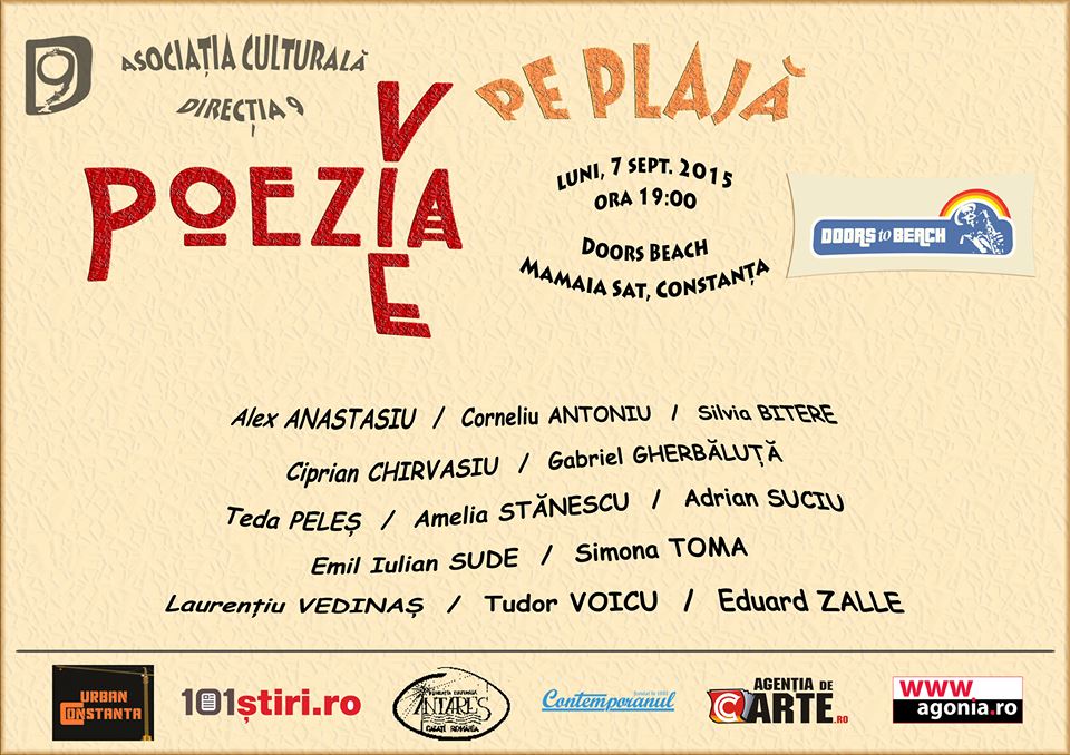 Dacă serile de poezie de la Costinești se vor desfășura într-o locație neconvențională, de pe strada Liliacului, nr. 7, și recitalul poetic de la Mamaia Sat va fi găzduit într-un spațiu magic, pe plajă, la Doors Beach, luni, 7 septembrie, cu începere de la ora 19.00. „O seară de poezie de neuitat, la malul mării, oferită de Direcția 9! Intrarea e liberă, ieșirea e mai grea! Nu uitați să puneți în băgăjele costumul de baie!”, îi „avertizează”, cu umor, poetul Adrian Suciu pe toți cei care doresc să participe la o seară culturală inedită, pe nisip, aproape de mare.