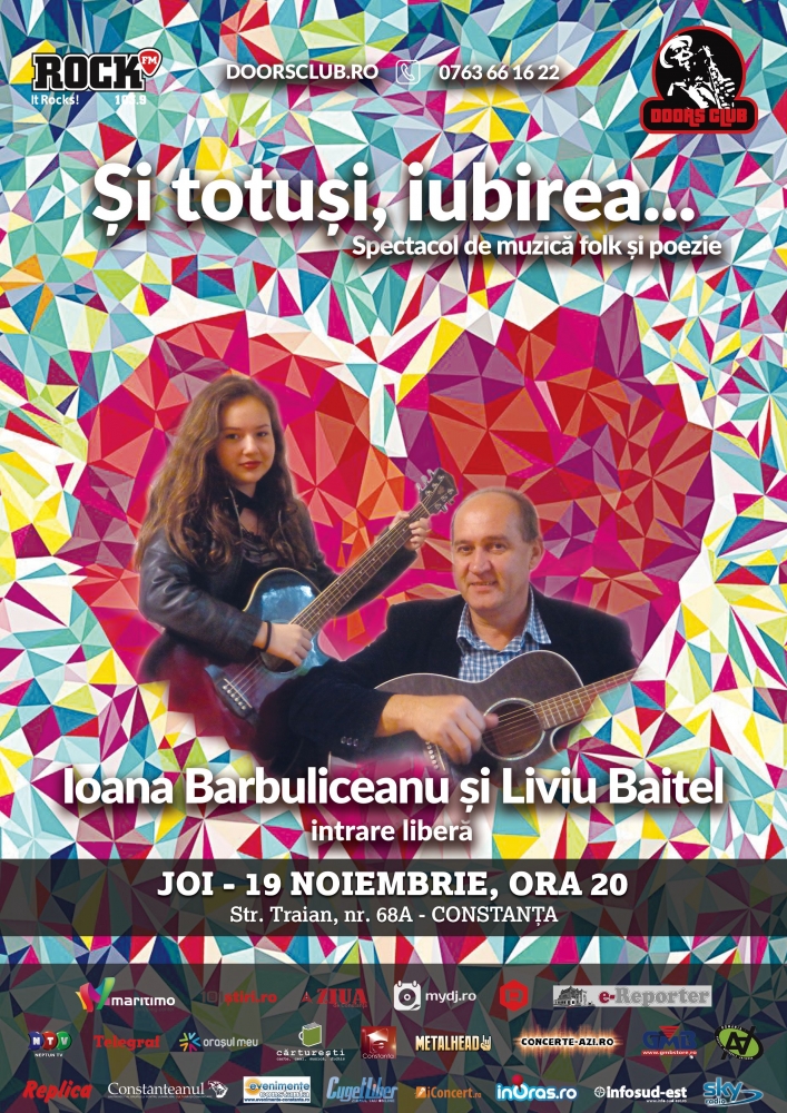 „Și totuși, iubirea...” Astfel, în această joi, de la ora 20.00, pe scena Doors vor cânta Ioana Bărbuliceanu şi Liviu Băiţel. Cantautorii le propun constănțenilor recitalul „Și totuși, iubirea...”, sub semnul nostalgiei şi al romantismului cântecelor anilor ’80, pe versurile celui care a fost Adrian Păunescu. Nu vor lipsi, însă, nici piesele noi, fie deja consacrate, fie compuse de cei doi cantautori și cântate în primă audiţie.