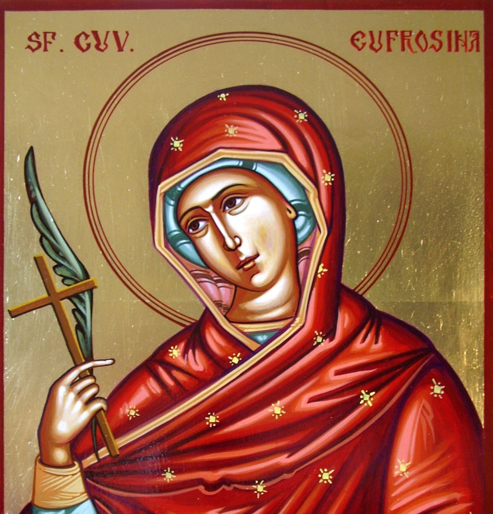 Sfânta Cuvioasă Eufrosina a trăit în Alexandria, în vremea împăratului Teodosie cel Mic (sec V). Ea a fost rodul stăruinței în rugăciune către Dumnezeu a părinților ei, care i-a binecuvântat cu nașterea de prunci după o vreme îndelungată. Potrivit crestinortodox.ro, la vârsta de 12 ani, Eufrosina a devenit orfană de mamă, rămânând în grija tatălui său, Pafnutie.