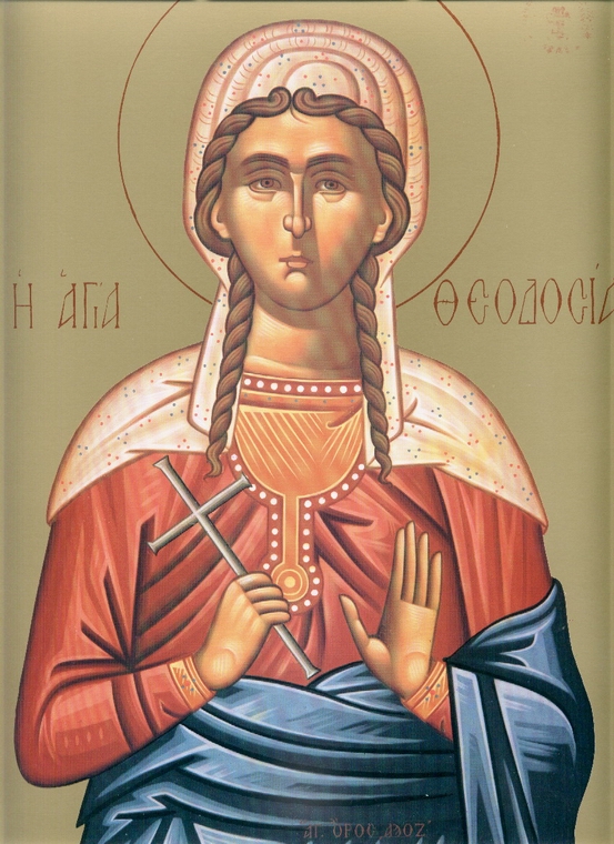 Sfânta Teodosia s-a născut în Tir (Fenicia). Conform lui Evsevie, episcopul Cezareei Palestinei, martor, Teodosia s-a apropiat de creştinii închişi în temniţă şi i-a întărit în mucenicia lor. Potrivit crestinortodox.ro, din această cauză, sfânta a fost dusă de soldaţi înaintea judecătorului. Acesta auzind cele întâmplate, a poruncit să i se lege o piatră de gât şi să fie aruncată în mare. Se spune că, prin purtarea de grijă a lui Dumnezeu, îngerii au adus-o la mal nevătămată.