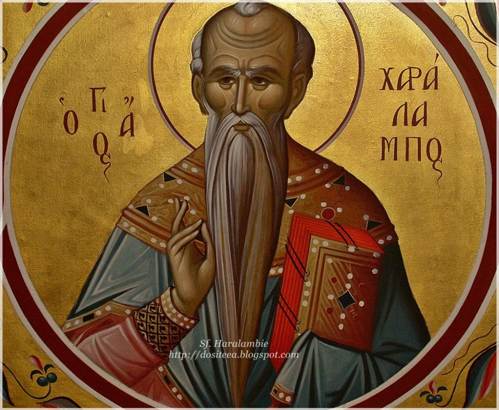 Sfântul Haralambie a fost episcop în Cetatea Magneziei, din Asia Mica (Turcia de astăzi), în vremea împăratului Septimius Sever (193-211). La vârsta de 113 ani, Haralambie a fost supus la diverse chinuri, pentru a se lepăda de credința în Hristos. În timpul torturilor, s-a petrecut o minune: mâinile guvernatorului Lucian s-au lipit de trupul sfântului și au rămas acolo până când mucenicul a spus rugăciunea. A fost momentul în care toți cei care îl torturau s-au convertit la creștinism.