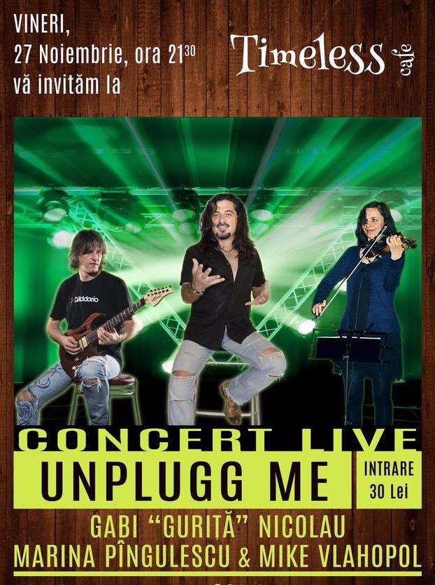 Timeless Cafe din Constanța invită publicul de la malul mării, vineri, 27 noiembrie, de la ora 21.30, la un concert live cu trupa Unplugg Me. Show-ul va fi susținut de membrii formației, Gabi „Guriță” Nicolau, Marina Pângulescu și Mike Vlahopol. Cei interesați să petreacă o seară de excepție, în compania unor artiști talentați, își pot procura biletele la prețul de 30 de lei, de la sediul Timeless Cafe.