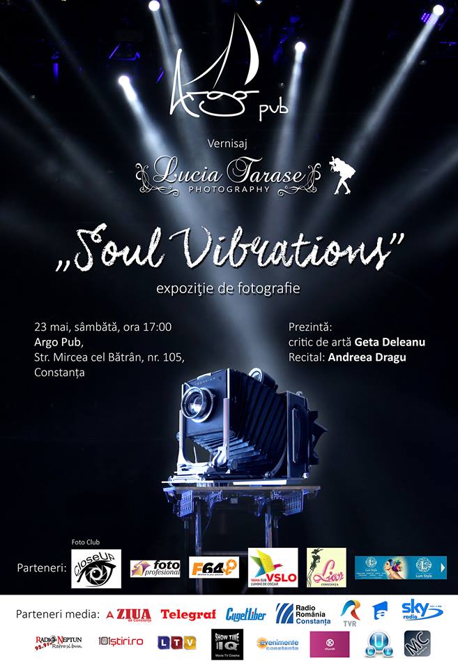 Artistul fotograf Lucia Tarase va fi, în această sâmbătă, 23 mai, de la ora 17.00, în Argo Pub din Constanța, protagonista unui eveniment expozițional special. Autoarea unor creații fotografice inspirate, reunite în expoziția „Soul Vibration”, Lucia Tarase promite să încânte publicul cu imagini emoţionante, vii, pertinente.