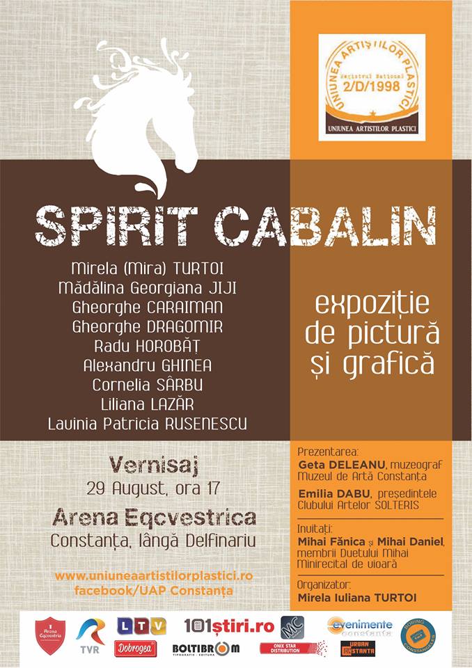 Ultimele zile de vară aduc la malul mării o frumoasă expoziție de pictură și grafică, intitulată „Spirit cabalin". Evenimentul expozițional se va desfășura la Arena Eqcvestrica din Constanța, de lângă Delfinariu, sâmbătă, 29 august, de la ora 17.00 și va aduce în atenția publicului lucrări semnate de o serie de plasticieni talentați, din cadrul Sucursalei Uniunii Artiştilor Plastici Constanța.