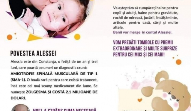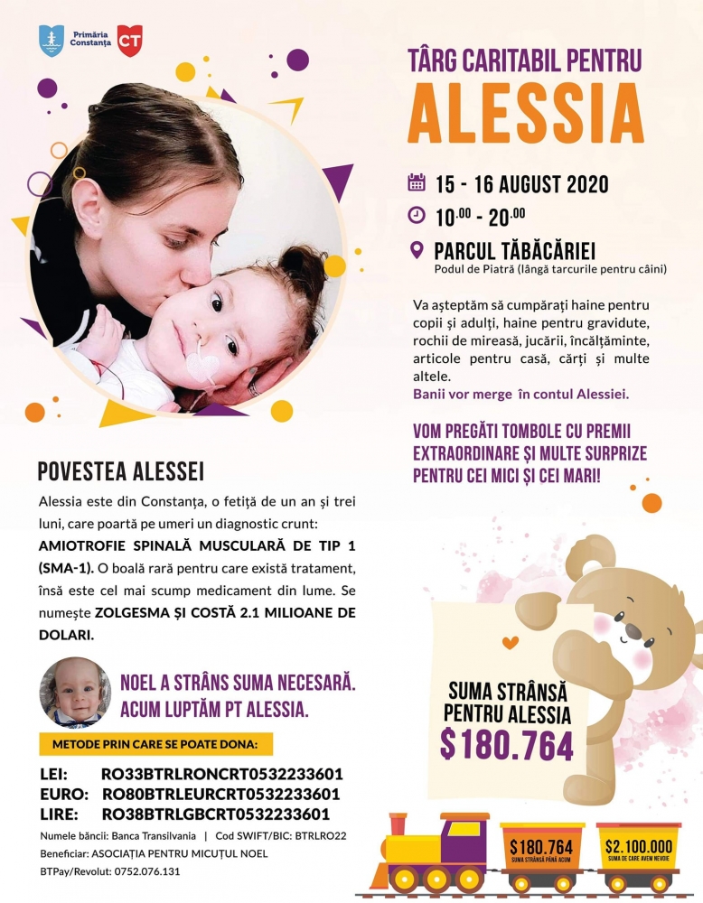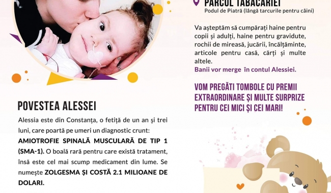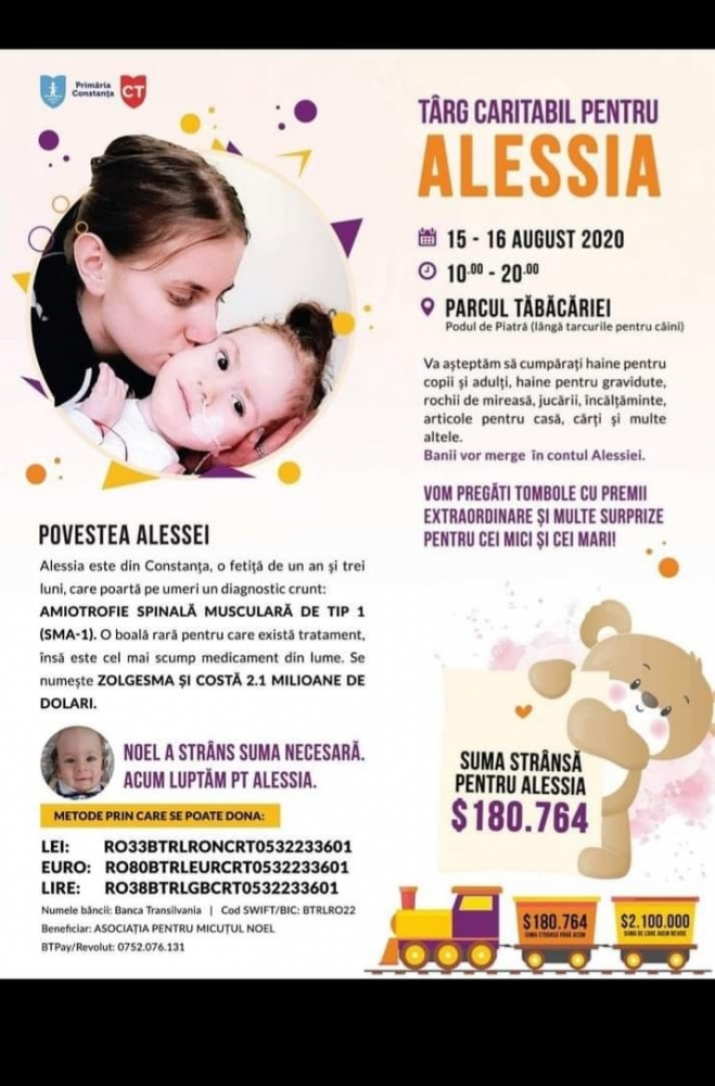 Iată că suma aceasta exorbitantă nu i-a speriat pe oamenii de suflet, care au organizat pe Facebook o campanie de strângere de fonduri pentru ajutorarea Alessiei. Mai mult, cu sprijinul Primăriei Constanța, în zilele de 15 și 16 august 2020, între orele 10.00 – 20.00, în Parcul Tăbăcărie, zona Podul de Piatră (lângă țarcurile pentru căței) se va desfășura un târg caritabil, iar toate fondurile strânse vor fi donate către ea. Veți putea cumpăra îmbrăcăminte pentru adulți și copii, jucării, articole de decor, cărți, cosmetice, accesorii de uz casnic. Organizatorii anunță că va fi și o tombolă, unde puteți câștiga premii sau servicii oferite de sponsorii evenimentului.