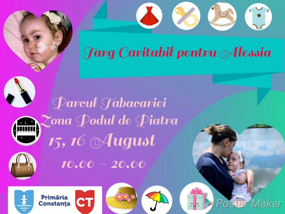 Așadar, mămici, tătici și bunici, constănțeni, dar și turiști care vă aflați, în această perioadă, la malul mării, sunteți așteptați să participați în număr cât mai mare la acest târg caritabil. Orice contribuție, oricât de mică, este importantă în lupta Alessiei pentru viață!