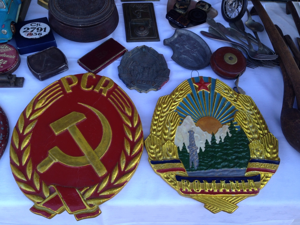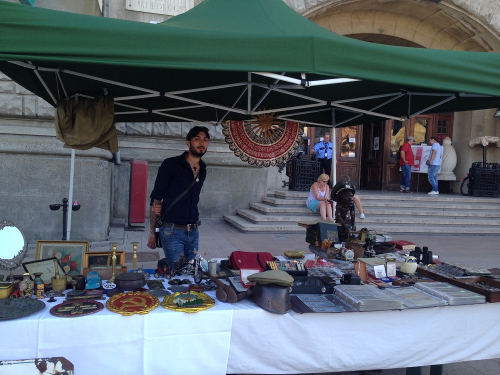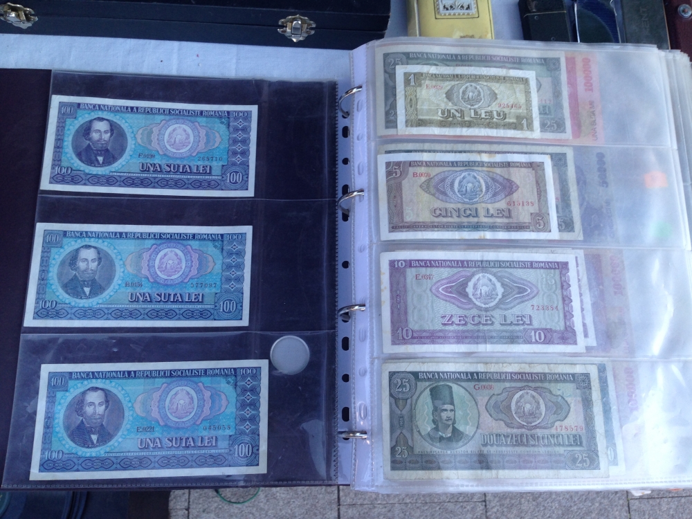 10.000 de timbre naziste și regaliste, embleme comuniste, bancnote vechi La unul din standurile amplasate aproape de intrarea în Muzeul de Istorie, un colecționar din Constanța, Tiberiu Cristea, și-a prezentat oferta jurnaliștilor de la www.101stiri.ro, cât se poate de convingător. „Cele mai valoroase obiecte de la stand sunt două embleme comuniste, una e cu secera și ciocanul, iar cea de-a doua e cu stema României. Avem bancnote vechi, începând de la 1896 până la banii de după Revoluție, cu valoare nominală mare. Bancnotele sunt românești, de pe timpul lui Ceaușescu, avem de 100 de lei, care costă acum 10 lei bucata, depinde de starea lor. Sunt și de 3, 5, 25 și 50 de lei, avem și bancnote regaliste și din toată lumea. Sunt, de asemenea, diferite embleme din perioada regalistă, monede, decorații, medalii regaliste. Avem și 10.000 de timbre, naziste, regaliste, vechi, din majoritatea țărilor europene, dinainte de 1900. Avem aici și o pușcă pentru copii, replică după Kalashnikov. Prețurile sunt negociabile, cele mai valoroase exponate sunt cele două embleme comuniste, fac 1000 lei ambele”, a spus acesta.